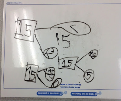 In math, my students are learning about the numbers 11-20. After my small group instruction I gave my students the task to independently show me what they know about the number 15. I didn't give them any specifics of what I was looking for, just to show me what they knew about the number. After math centers, my students were sharing out his/her 'Discovery of the Day'. As I was circulating, I heard a student sharing with his partner the ways he discovered to make 15. When I looked at his board this is what I saw...